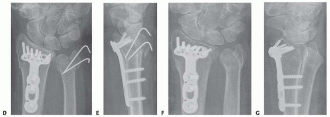 FIG 3 •(continued)D,E. The distal radius fracture was stabilized using a volar locking plate. The ulnar head and styloid fractures were partially reduced and fixed with two Kirschner wires. The surgeon adequately secured the ulnar styloid fracture but not the ulnar head fracture and postoperatively did not restrict forearm rotation. F,G. These radiographs reveal the eventual ulnar head malunion that resulted in DRUJ instability and diminished forearm rotation. The situation was salvaged using an ulnar head replacement prosthesis. DRUJ stability is an important treatment goal.