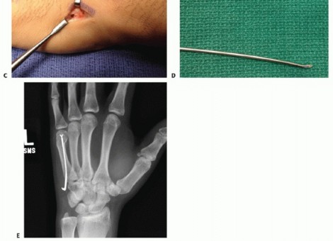 TECH FIG 2 • A. Angled metacarpal neck fracture. B. Incision at the ulnar base of the fifth metacarpal, exposing the insertion of the extensor carpi ulnaris (ECU) on the base of the metacarpal. Incision located on ulnar aspect of metacarpal to minimize irritation of the extensor tendons. C. Unicortical tunnel at the base of the metacarpal. D. Sample of prebent pin. Tip is angled to facilitate passage through the shaft. E. In metacarpal neck fractures or those at risk of shortening, it is important to bring the pins to the subchondral bone of the metacarpal head but not violate the head.