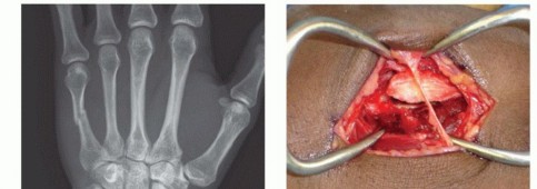FIG 6 • Dorsal approach to the MP joint of an index finger. Extensor tendon beneath top retractor. Capsule grabbed by pickup forceps. Articular cartilage seen deep to capsule.