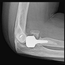 Figures 71a and 71b are the radiographs of a 65-year-old right-hand-dominant woman who sustained a Mason type III radial head fracture 3 years ago. She was treated with radial head replacement, but she never regained normal function and now has pain. What do the radiographs reveal?