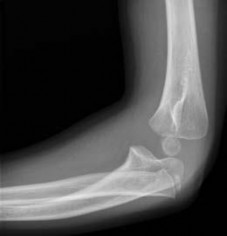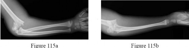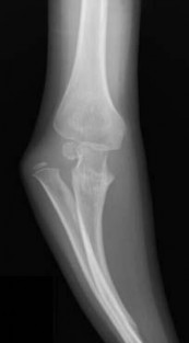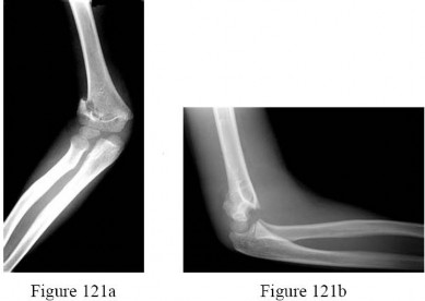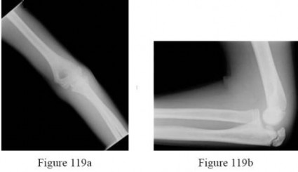 Figure 38 shows the radiograph of a 16-year-old wrestler who injured his elbow when he was thrown to the mat by his opponent. To minimize additional trauma to the medial soft tissues, the elbow should be reduced in