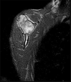 Figure 80a is the radiograph of a 5-year-old girl who has experienced 8 weeks of shoulder pain that is mostly relieved with nonsteroidal anti-inflammatory drugs. Her MR images are shown in Figures 80b through 80f. Histology is shown in Figures 80g through 80i. The most likely diagnosis is