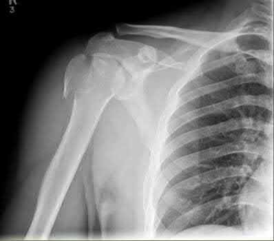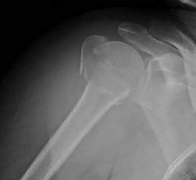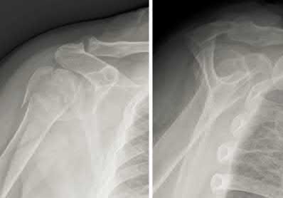 A 55-year-old male presents to your clinic after a fall off a ladder and landing on his left shoulder. On examination, he has a positive drop arm sign but full passive, but painful, range of motion of the left shoulder. Radiographs are shown in Figures A and
