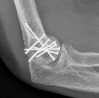A 62-year-old man falls on his porch and sustains an elbow injury. A radiograph is provided in Figure A. Which of the following is the best treatment?