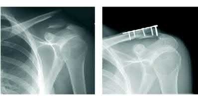 Figure 7 shows the radiograph of an 18-year-old hockey player who sustained a shoulder injury during a fall into the side boards. Examination reveals a significant prominence at the acromioclavicular joint. Management should consist of