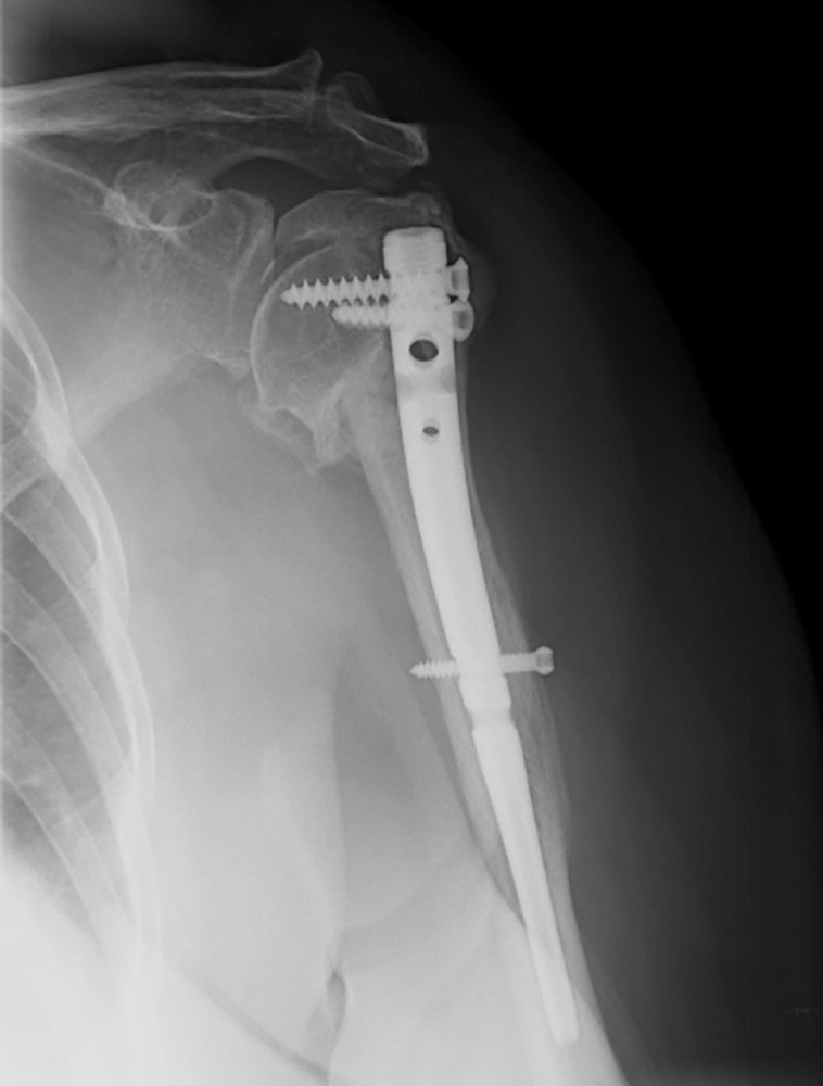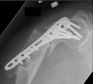 A 54-year-old woman who is an avid tennis player falls onto her dominant shoulder during a tennis match. Examination reveals tenderness and swelling in the shoulder region, but no neurovascular deficits. Radiographs and CT scan are shown in Figures A through E. Combined cortical thickness is 4.2mm. What is the most appropriate treatment option?