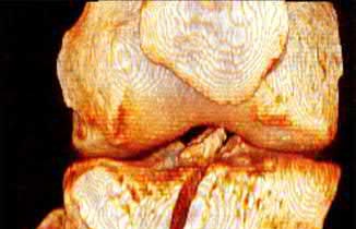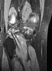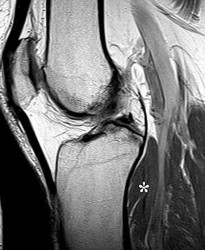 Figure 1 is the MRI scan of a high school hockey player who is checked from behind and falls forward to the ice onto his flexed knees. He complains of swelling and posterior knee pain. Nonoperative treatment of the injured structure will most likely result in increased risk of degenerative change in