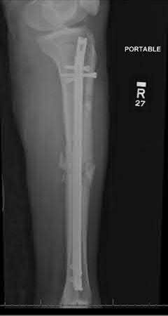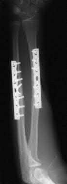 A 19-year-old man sustains a low-velocity gunshot wound to the forearm. What