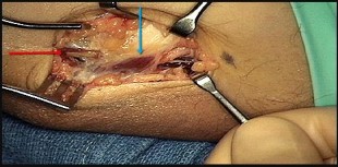 Figures 2a and 2b are the clinical photographs taken at the time of cubital tunnel surgery. The ulnar nerve is indicated by the red arrow. What is the name of the structure at the tip of the blue arrow?