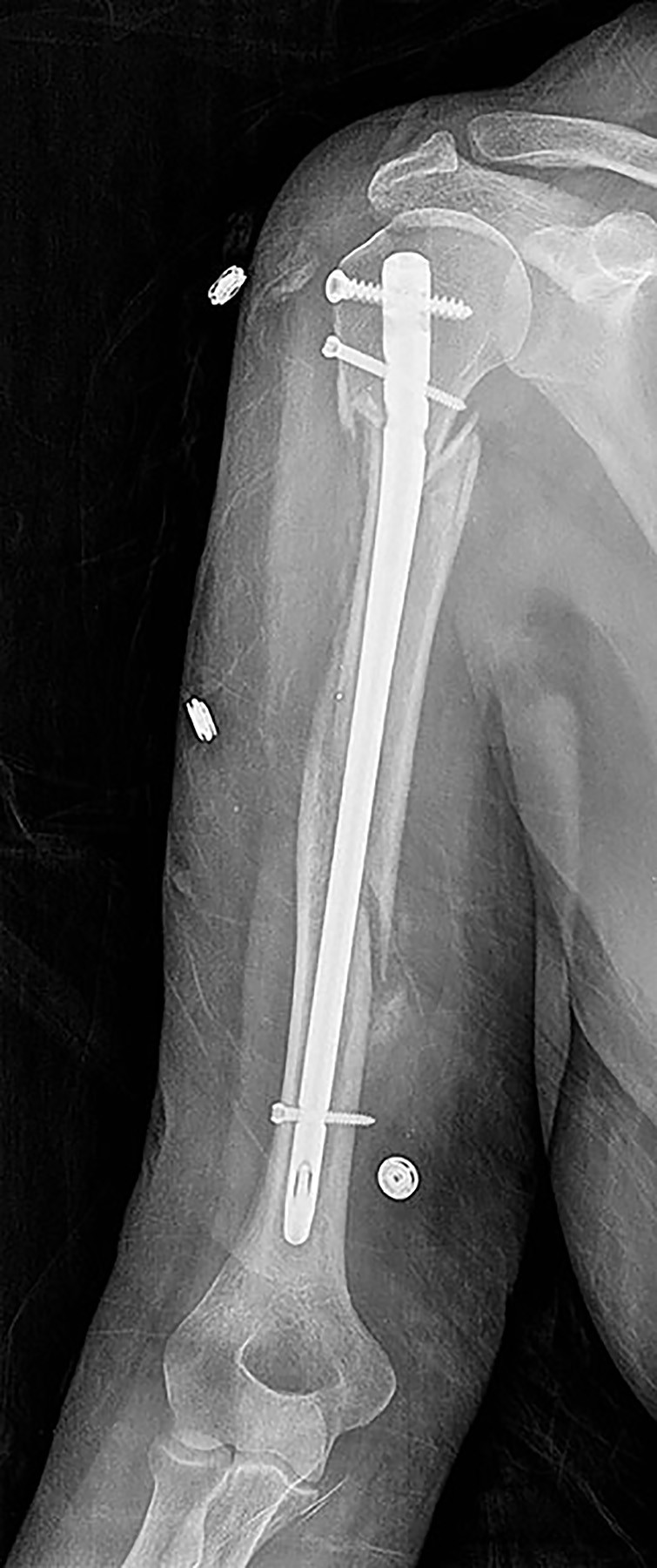 A 21-year-old patient has had pain and a marked decrease in active and passive shoulder motion after having had a seizure 2 months ago as the result of alcohol abuse. Current AP and axillary radiographs and a CT scan are shown in Figures 26a through 26c. Management should consist of