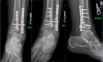 Figure A shows an isolated left ankle injury in an active 48-year-old recreational hockey player. Past medical history includes insulin dependent diabetes mellitus for 35 years. On physical examination the patient is unable to feel a 5.07 gm monofilament on the plantar aspect of his foot. His pedal pulses are palpable. Of the following options, what would be the recommended treatment?