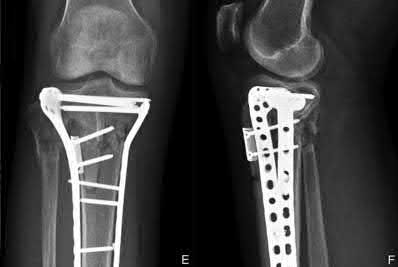 Figures 1 and 2 are the recent radiographs of an 82-year-old man with rheumatoid arthritis who underwent total knee arthroplasty (TKA) 18 years ago. These radiographs reveal osteolysis with loosening of the tibial component. Aspiration and laboratory study findings for infection are negative. During the revision TKA, treatment of tibial bone loss should consist of