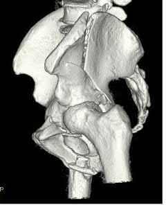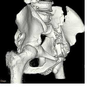 The CT exhibits a posterior wall acetabular fracture, which is fixed via a Kocher-Langenbeck approach. The sciatic nerve, which comes out of the greater sciatic notch, is at the least amount of tension with the hip extended and knee flexed to 90 degrees.