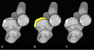 The anteromedial facet is highlighted in yellow as displayed in Illustration A. Illustration B depicts the lateral collateral ligament injury also evident during