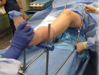A 34-year-old man is involved in a motorcycle accident and sustains a closed tibia fracture and multiple rib fractures. A radiograph is provided in Figure A. During surgical treatment of this fracture, which of the following techniques will help facilitate a successful reduction and intramedullary fixation?