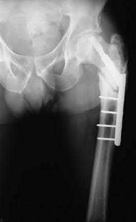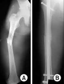 Figure A shows a proximal third femoral shaft fracture that was treated with intramedullary nailing. The oblique fracture line remains evident with a small callus response at the fracture site at 8 months post-operative. Figure B shows an radiograph of the exchange femoral nail 7 months after revision sugary.