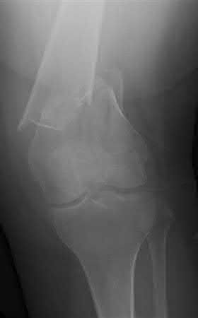 Figures A, C, D and E show supracondylar distal femur fractures that can be treated with ORIF with a fixed-angle device such as lateral locked plating.