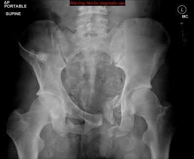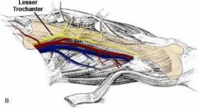 Figure A demonstrates a displaced subtrochanteric femur fracture with an intact lesser trochanter. The pull of iliopsoas on the lesser trochanter as well as the intact external rotators and gluteal musculature results in the the proximal fragment being in a flexed and externally rotated or abducted position (the most common post operative deformity). Reduction manuevers must be biologically friendly but also counteract the flexion/abduction moment. Lundy's review article discusses evaluation and treatment of subtrochanteric fractures. The review article details the various implants often used which include 95 degrees plates, femoral reconstruction nails, or trochanteric femoral nails with interlocking options. Lundy's article discourages the use of the 135 degree screw and side plate combo due to high failure rates in these fracture patterns. Bedi et al also review treatment of these fractures and discuss common