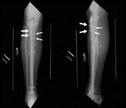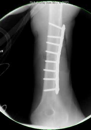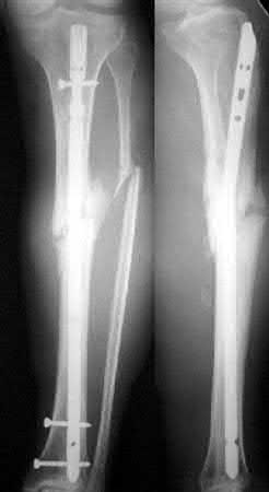 Vallier et al performed a randomized prospective study to compare plate and nail stabilization for distal tibia shaft fractures by assessing complications and secondary procedures. One-hundred and four patients were randomized to either reamed intramedullary nailing, or medial distal tibia plate fixation.