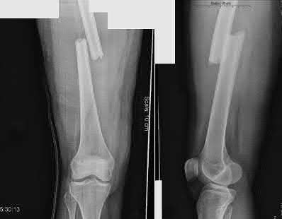 The clinical scenario and radiograph demonstrate a proximal tibia fracture amenable to intramedullary nail fixation. The suprapatellar nailing technique helps prevent apex anterior or procurvatum deformity typical of these injuries.