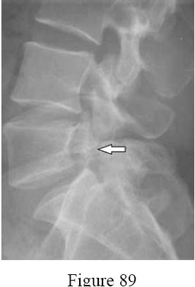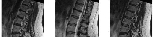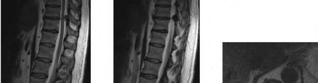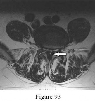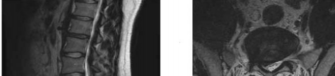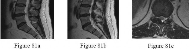 both lower extremities. The patient is slow in getting up from a seated position and has an unsteady widebased gait. An MRI scan of the lumbar spine is shown in Figure