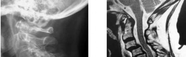 The sagittal T2-weighted MRI scan shows moderate-severe multilevel cervical stenosis.The cord compression is noted to be not only