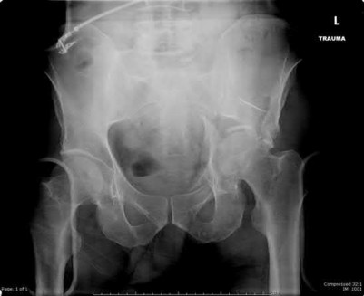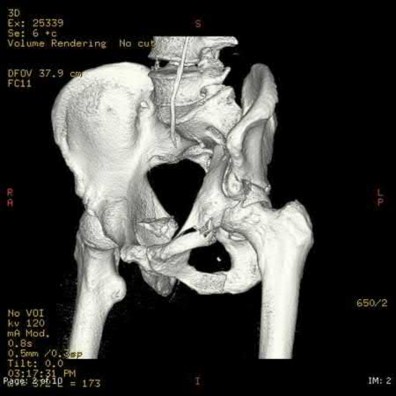 Bartkiw et al. reviewed 2808 GSW and found 1235 associated fractures including 42 fractures of the hip and pelvis. They performed 10 orthopaedic procedures on 7 patients. All fractures healed with no pelvic ring instability or chronic osteomyelitis. They recommend orthopedic intervention for intraarticular projectiles or bone fragments, and reconstruction of the hip and acetabulum.