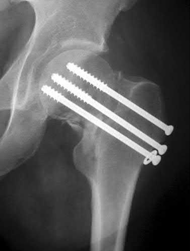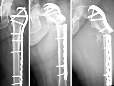 Hartford et al. describe fixing intertrochanteric osteotomies with dynamic hip screws in 8 patients with femoral neck fracture (Pauwels type III) nonunion. The fracture plane decreased from 68° to 41°, and hip scores increased. Seven fractures healed (1 patient died). They recommend this technique for reliable fixation of intertrochanteric valgus osteotomies for femoral neck nonunion.