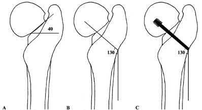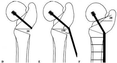 Figure A shows nonunion of a femoral neck fracture after cannulated screws. Figure B shows a fracture line at 40° to the horizontal. Figure C shows DHS screw trajectory 130° to the vertical. Illustration A shows the technique of fixation of a fracture with a 40° angulation to the horizontal with a 20° lateral closing wedge osteotomy and a 150° DHS sideplate (parts A-F). Illustration B shows the same fracture fixed with a fixed angle device (left, blade plate) that went on to union (right, radiograph 7 years later). Illustration C shows correction of the fracture angle from 55° to 20° with a traditional Pauwels 35° valgization osteotomy.