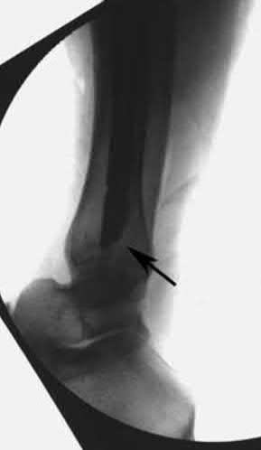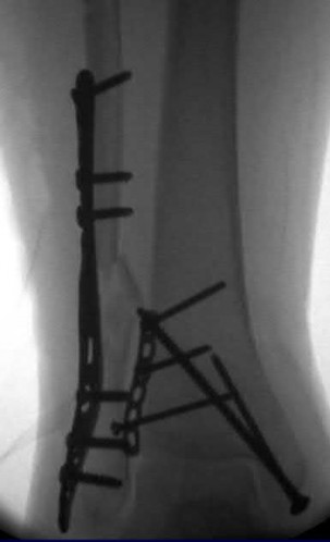 In the distal tibial metaphysis, there is no snug endosteal fit for an IM nail. Center-center nail placement in both proximal and distal fragments is necessary to maintain alignment. There is also increased stress on distal locking bolts to maintain fracture alignment. Assuming static medial-lateral distal locking screws, accurate coronal plane and rotational alignment is achieved by fibular plating as a first step. This also prevents late loss of alignment because of distal locking screw toggle. Reamed nailing allows a stiffer, larger nail to be placed, and allows redistribution of endosteal osteogenic material to the fracture site. Although there is endosteal vascular compromise, this does not affect fracture healing because of intact periosteal supply.