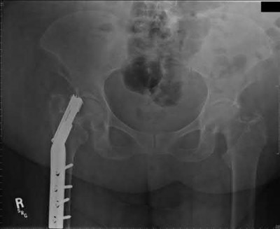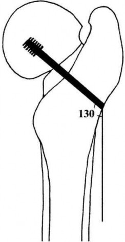 This patient had a femoral neck fracture fixed with cannulated screws that subsequently went into nonunion. The valgization (valgus producing intertrochanteric) osteotomies that will correct this deformity is a 20° wedge osteotomy held with a 150° side plate.