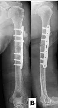 Figure A demonstrates an AP radiograph of a comminuted humeral shaft fracture with varus alignment.