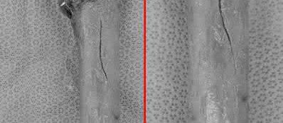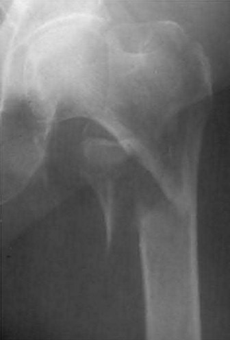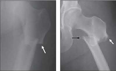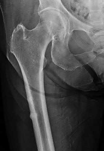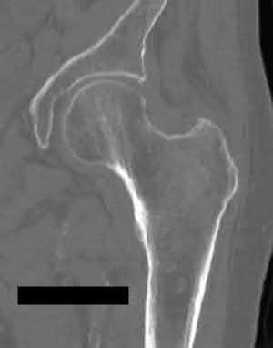 Figure A is a AP radiograph of the left hip and pelvis. Apart from a healed fracture of the ischiopubic rami and generalized osteopenia, there is no obvious hip fracture. Figure B is a coronal CT image that does not demonstrate evidence of an acute hip fracture. Illustration A is a T1 weighted MR image that shows a non displaced fracture (white arrow) through the intertrochanteric region of the left proximal femur.