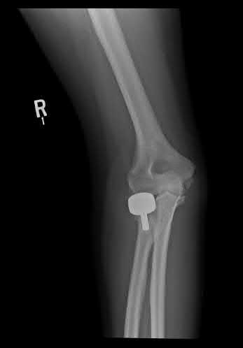 Illustration A shows a intraarticular fracture of the distal humerus in a patient with rheumatoid arthritis, severe osteoporosis, and preexisting arthritic changes who was treated with a total elbow replacement.