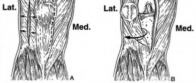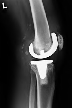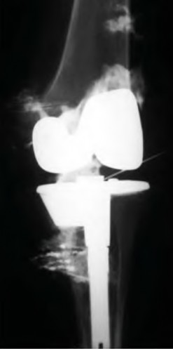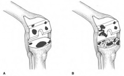 Illustration B shows tibial tray lift off with flexion. This is due to the femoral component impinging on the tibial tray posteriorly and causing lift off of the tray anteriorly.