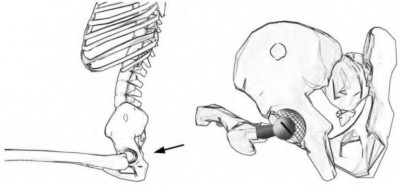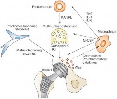 Osteolysis of the femur is caused by activation of macrophages by microscopic polyethylene particles within the "effective joint space", defined as any area where joint fluid can come into contact with bone. This can occur above the acetabular cup, through screw holes, and down the femoral shaft around the prosthetic stem. Ideally, with a cementless stem, both the proximal and metaphyseal femur are well filled by the prosthesis. Collared stems are used to augment poor calcar bone quality or bone loss.