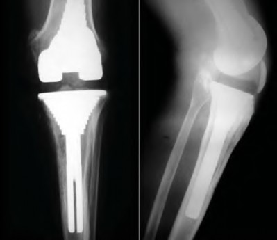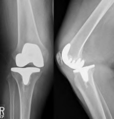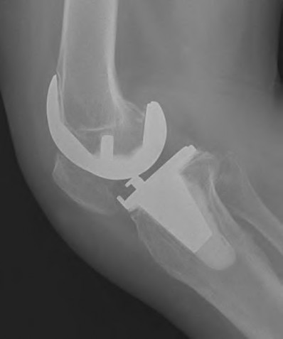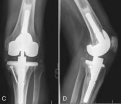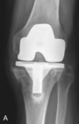 Figure B shows a cruciate sacrificing total knee arthroplasty with implants in a good position.