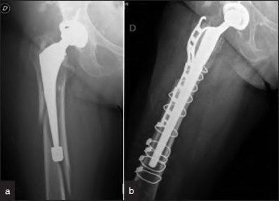 Springer et al. retrospectively reviewed 118 hips with Vancouver B fractures. Seventy-seven percent of 30 extensively coated stems, 60% of 42 cemented stems, 36% of 28 proximally coated stems, and 61% of 18 tumor prosthesis/allo-prosthetic composite stems were well fixed and demonstrated