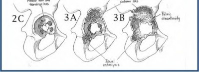 Figure A depicts a radiograph of a Vancouver type C periprosthetic femur fracture, occurring distal to the stem of the total hip arthroplasty. Figure B demonstrates a Vancouver type A periprosthetic fracture of the greater trochanter. Figure C is an x-ray of a Vancouver type B2 periprosthetic fracture adjacent to the stem with an unstable implant, but adequate bone stock.