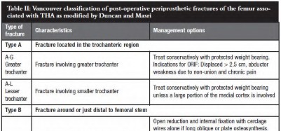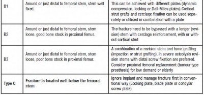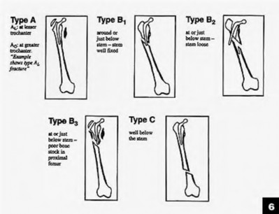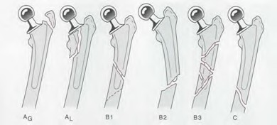 The Vancouver classification for total hip periprosthetic femoral fractures takes into account the three most important factors in management of these injuries: the site of the fracture, the stability of the femoral component, and the quality of the surrounding femoral bone stock. Type A fractures include those involving the lesser trochanter or the greater trochanter. Type B fractures occur around the stem or just below it. More specifically, B1 fractures have a well fixed stem, B2 fractures have a loose stem but good proximal bone stock and B3 fractures have a loose stem with proximal bone that is of poor quality or severely comminuted. Type C fractures are well below the tip of the femoral stem.