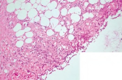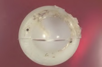 Illustration A shows a polyethylene liner that has undergone catastrophic wear as a result of irradiation in the presence of oxygen.