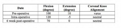 Issa et al. examined a cohort of patients that underwent MUA after TKA. At a mean follow-up of 51 months (range, 24 to 85 months), the mean gain in flexion in the MUA cohort was 33° (range, 5° to 65°). There was one periprosthetic fracture in 134 patients. The authors noted a significant improvement in ROM from pre-manipulation values.