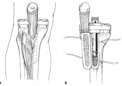 Illustration A shows normal tibial tray seating at the time of total knee arthroplasty.