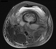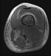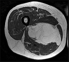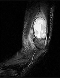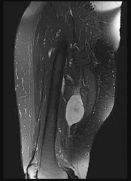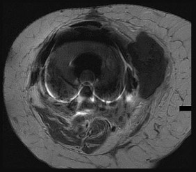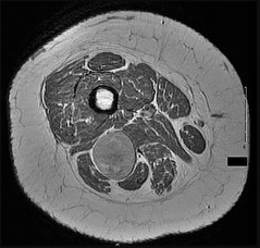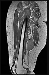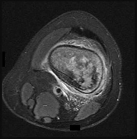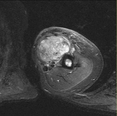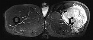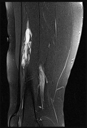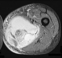 MR imaging reveals a lesion within the vastus intermedius muscle that has signal characteristics consistent with vascular structures and a “bag-of-worms” appearance consistent with a vascular malformation. T1-weighted MR imaging shows fat interspersed among the tissue consistent with a vascular malformation. Vascular malformations often can be determined on imaging alone, particularly if the radiographs reveal phleboliths. Biopsy is generally unnecessary and open biopsy can be particularly difficult due to significant bleeding if performed without the tourniquet, and difficulty identifying the lesion if a tourniquet is utilized. Wide resection generally is unnecessary because these lesions do not have malignant potential. Excision of vascular malformations can be curative, but many patients experience symptom relief with percutaneous sclerotherapy. This patient should be referred for consideration of this less morbid minimally invasive approach.