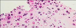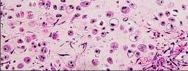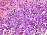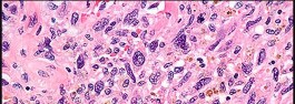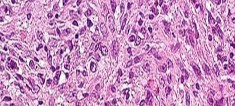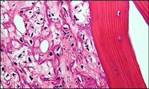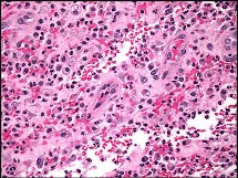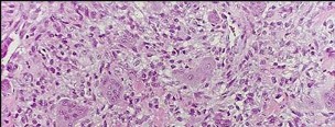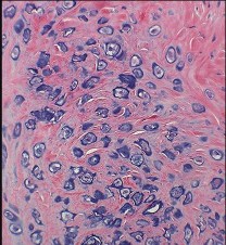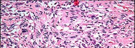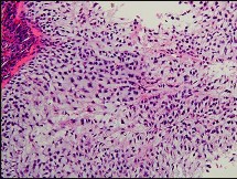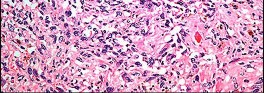 This pathology is most consistent with giant-cell tumor. Note the presence of multinucleated cells and stroma of spindlelike cells with pale staining cytoplasm and nuclei. Giant-cell tumors typically occur in patients ages 20 to 40. Common sites include the epiphysis of the distal femur or proximal tibia (50% of the time). Although it is a benign lesion, giant-cell tumors have a tendency for bone destruction, recurrence, and, rarely, metastasis. The initial treatment of choice is curettage with grafting or cementation. For recurrent or stage III tumors, wide excision may be necessary. Chemotherapy or radiation therapy are not indicated as initial treatment, especially if this is an isolated primary lesion.