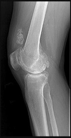 The images reveal a solitary pedunculated osteochondroma. Malignant degeneration of solitary osteochondromas occurs in fewer than 1% of patients. A reasonable approach would be to inform the patient of the rare (less than 1%) incidence of malignant degeneration and to return for evaluation if symptoms develop or if the patient notices growth of the lesion.