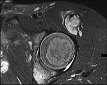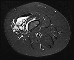 Synovial sarcoma is a soft-tissue sarcoma that usually occurs in young adults. Synovial sarcoma often causes pain, unlike most soft-tissue sarcomas, which generally do not cause pain. Imaging characteristics include soft-tissue calcifications on plain radiographs and a heterogeneous mass that is generally isointense to muscle on T1-weighted images and hyperintense to muscle on T2-weighted images. There are biphasic and monophasic types of synovial sarcoma. The biphasic
