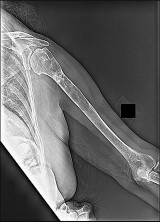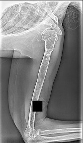 Figures 93a through 93f are radiographs, selected MR imaging sequences, and biopsy specimens of the left humerus of a 76-year-old woman who has experienced long-term left arm pain. She has received previous treatment for osteoarthritis of her left shoulder with nonsteroidal anti-inflammatory drugs and an intra-articular corticosteroid injection for her rotator cuff arthropathy. Recent staging studies show no evidence of metastatic disease. What is the most appropriate next treatment?
