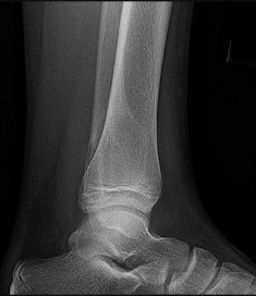 Figures 94a through 94f are the radiographs and MR images of a 16-year-old boy who experiences left ankle pain with activity. What is the most likely diagnosis?
