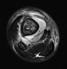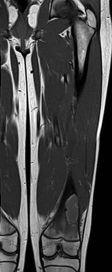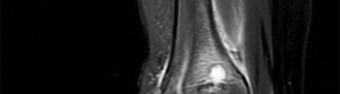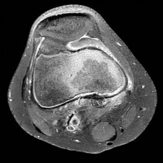 A 6-year-old boy had a 4-day history of worsening atraumatic right thigh and knee pain. He was seen in the emergency department, where he had a temperature of 39.1°C. Laboratory studies reveal a white blood cell count of 15000 /µL (reference range, 4500-11000 /µL). He had a small knee effusion with range of motion 0 to 90 degrees and a swollen, painful, hot distal thigh. The knee effusion was aspirated, revealing a white blood cell (WBC) count of 2000 with negative gram stain (reference range < 2000 WBC/mL). The boy was admitted to the pediatric medical service and intravenous (IV) antibiotics were initiated. The next day, MR